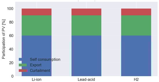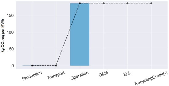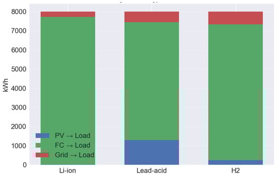 The decomposition of the supplied energy shows that the product is mainly served by stored energy, with direct photovoltaic batteries used as a secondary channel and the remainder covered by grid imports (Figure 6). Lead-acid batteries show the largest share of direct photovoltaic batteries in the product, while the hydrogen case shows a slightly higher dependence on grid energy, which helps to express its higher operational global warming potential.