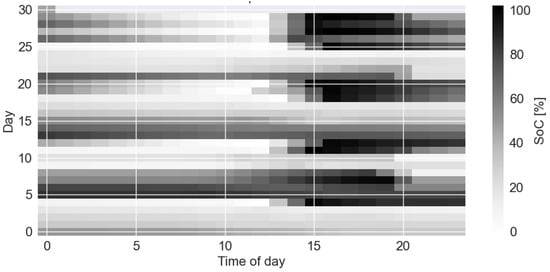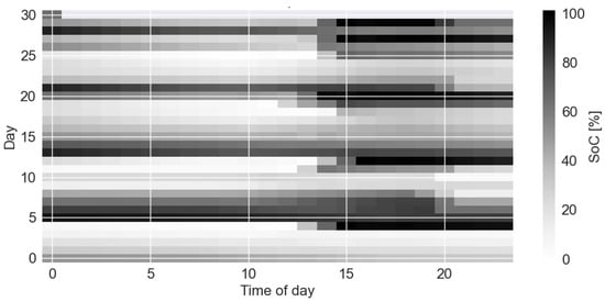 The SoC heat maps show stable diurnal cycles for both batteries (Figure 7 and Figure 8). Lithium-ion batteries charge faster at noon and discharge better in the evening peaks, consistent with a tighter RTE and power capacity, while lead-acid batteries show deeper fluctuations and a tendency to remain at high heat levels later in the day, reflecting tighter power/efficiency constraints.