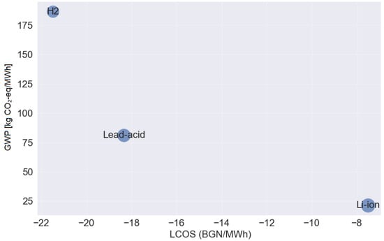 The LCOS–GWP bubble plot positions lithium-ion batteries as the most favorable option in this case, with lead-acid intermediates and hydrogen as the least favorable (Figure 13). The apparent near-zero or negative LCOS values reflect the interaction of purchase and sale prices and come from the sum; they are tariff-specific and should not be generalized without caution. The waterfall plots for each technology (Figure 8, Figure 10 and Figure 11) and the accumulated contributions (Figure 14) demonstrate that the cost and environmental impact distribution strongly depend on the intended use case and market context.