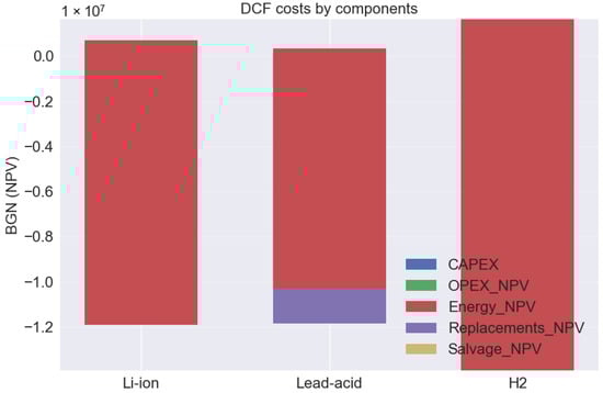 The DCF breakdown highlights Energy_NPV (net life cycle energy purchases minus sum revenue) as the dominant cost component in this scenario for all technologies (Figure 14). Only lead-acid batteries show a visible net present value of replacement (Replaces_NPV), consistent with their shorter life cycle. This highlights that the tariff design and operating profile can exceed the capital cost of equipment in the life cycle economy.