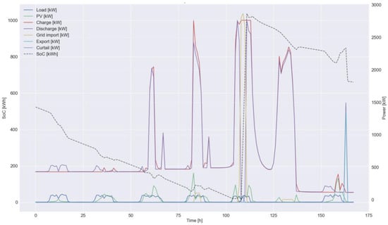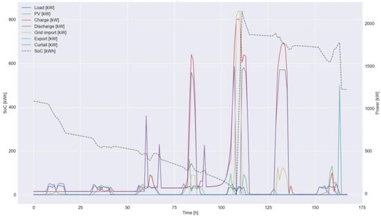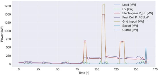 Dispatcher capacity traces confirm these patterns (Figure 15, Figure 16 and Figure 17). Lithium-ion batteries cover sharp demand ramps with limited grid imports; moderate curtailments and volume occur around PV peaks. Lead-acid batteries follow a similar quality profile but with more frequent imports during ramps. The hydrogen system alternates between electrolyzer operation (charging the H2 supply when PV or cheap power is available) and fuel cell discharge during peaks; short import peaks coincide with the electrolyzer operating near its nominal capacity, illustrating the energy-intensive hydrogen charging.