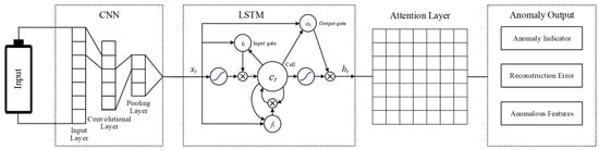 CNNs can extract local patterns from time-series data through one-dimensional convolutions, such as short-term voltage fluctuations and instantaneous temperature variations. LSTM is suitable for capturing long-term dependencies, such as voltage decay trends over charge–discharge cycles. Attention mechanisms assign different weights to each time step according to its importance in the input sequence, thereby automatically focusing on critical moments around anomaly occurrences during the detection process. By combining a CNN, LSTM, and an attention mechanism, our model is able to simultaneously capture both local and global temporal features, improving the accuracy and robustness of anomaly detection.
