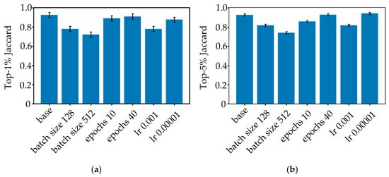 Stability analysis under different hyperparameter settings. (a) Top 1% Jaccard (mean ± std) comparison. (b) Top 5% Jaccard (mean ± std) comparison.