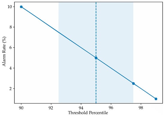 In unsupervised anomaly detection, threshold selection plays a critical role. Common strategies include fixed quantiles, statistical tests, and false alarm rate control. In this study, we examined multiple quantile thresholds (90%, 95%, 97.5%, and 99%) to analyze how the alarm rate varied with threshold settings (Figure 4). The results show a monotonic decrease in the alarm rate as the threshold increased, with the curve exhibiting smooth behavior and no abnormal fluctuations. The 95% quantile was chosen as the baseline threshold, as it lies in the middle of the curve: it avoids excessive alarms caused by overly low thresholds while preventing missed detections associated with overly high thresholds. This choice reflects a well-balanced and robust setting.
