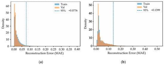 Since the dataset used in this study does not contain manual labels, it is not feasible to directly build a classification model through supervised learning; therefore, unsupervised methods must be employed for anomaly detection [32,33]. Accordingly, a threshold needs to be defined based on the statistical distribution. In this work, the 95th percentile of the reconstruction error distribution from the training set is adopted as the decision threshold. Such a tail quantile-based threshold setting relies on the residual distribution of the training set, thus providing a statistical basis [34]. In unsupervised anomaly detection, this approach balances sensitivity and specificity, thereby reducing excessive false positives and false negatives [35]. As the dataset is derived from monitoring data of electric bicycles during real-world operation, it is reasonable to assume that the vast majority of samples represent normal states, which satisfies the fundamental assumption of the reconstruction-based anomaly detection strategy.