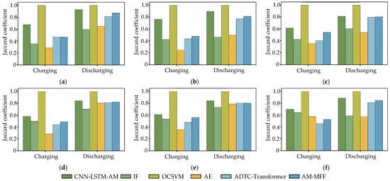 In contrast, the CNN–LSTM–Attention model achieved the most balanced performance. Its average Jaccard coefficient in the Top 5% range was approximately 0.74, and it outperformed classical frameworks such as Isolation Forest and autoencoder, which exhibited lower stability and larger fluctuations under random initialization. The advanced models, ADTC-Transformer and AM-MFF, demonstrated competitive performance but were less consistent across batteries and feature types. ADTC-Transformer achieved moderate stability, while AM-MFF occasionally reached high values but also showed substantial variability.