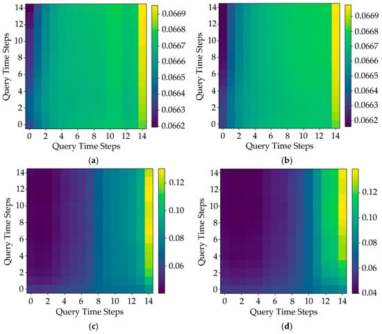 To investigate the interpretability of the CNN–LSTM–Attention model, we visualized the attention weight matrices for representative normal and abnormal windows under both discharging and charging feature types. Each window corresponded to 30 s of operational data (down-sampled to 15 time steps after convolution and pooling). The heatmaps in Figure 8 illustrate how the model allocated attention across different temporal positions.
