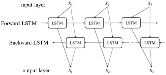 In the formula, represents the forward output of BiLSTM, and represents the backward output of BiLSTM. As shown in Figure 4, the structure of the BiLSTM network is presented.