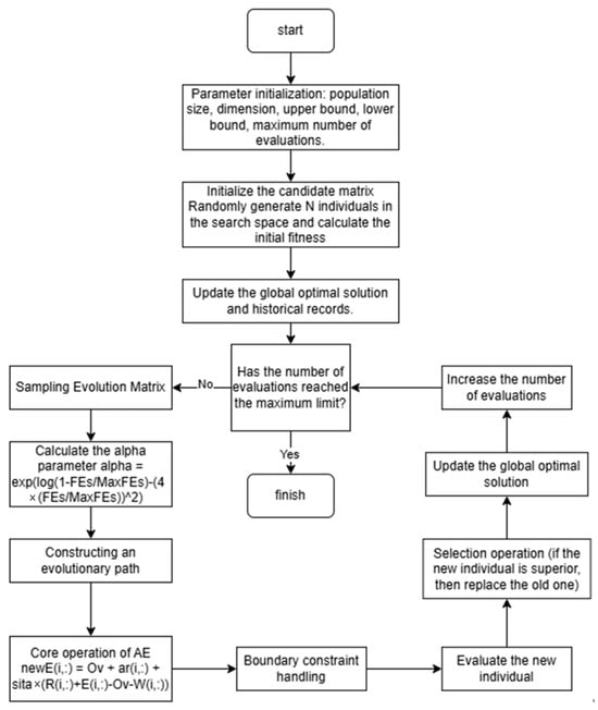 The AE algorithm is a new evolutionary algorithm that updates the solution using an alpha operator with adaptive basis vectors and random and adaptive step sizes [12]. Firstly, candidate solutions are selected to construct the evolutionary matrix. Through diagonal or weighted operations of the evolutionary matrix, the population state is estimated. To enhance the correlation of each generation’s estimation, the cumulative estimation results of two evolutionary paths are achieved to realize adaptive basis vectors. Secondly, the composite differential operation is used to construct adaptive step sizes to estimate the problem gradient, which is used to accelerate the convergence of acoustic emission; finally, the attenuation factor alpha is adjusted adaptively according to the search space to generate random step sizes, to balance exploration and exploitation. The AE algorithm introduces a dynamic adaptive search strategy, achieving a balance between global exploration and local exploitation capabilities through a unique Alpha parameter regulation mechanism. Compared with traditional genetic algorithms (GA), differential evolution (DE), and particle swarm optimization (PSO), the core innovation of the AE algorithm lies in its adaptive search strategy, which can dynamically adjust the search step size and direction according to the evolutionary process, effectively avoiding the premature convergence or low search efficiency problems caused by fixed parameters in traditional algorithms. The AE algorithm performs better than conventional algorithms in multiple algorithm tests of CEC. This paper uses this optimized algorithm to optimize the hyperparameters of neural networks and compares with conventional optimization algorithms. The performance of the method in this paper is better. Figure 5 below is the flowchart of the AE algorithm.