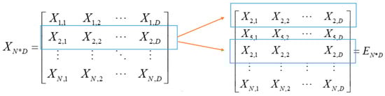 In order to find the optimal solution to the problem, it is necessary to improve the candidate solutions, which is a key step in the optimization algorithm. In this work, the set of candidate solutions is defined as the candidate matrix X, while the evolutionary matrix E is a subset of the candidate matrix. Please note that the overall concept is usually a metaphor for the solution set, and the solution set is essentially a matrix. During the evolution process, instead of directly evolving each solution Xi in the current candidate matrix, a sampling replacement operation is performed on the matrix to obtain the matrix to be evolved. The following Figure 6 describes this relationship: