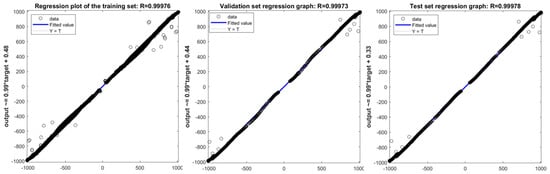 As can be seen from Figure 7, the regression graph of the training set, R = 0.99976; the regression graph of the validation set, R = 0.99973; and the regression graph of the test set, R = 0.99978, show the relationship between the predicted values of the model and the target values. From the graphs, it can be seen that the correlation coefficient is close to 1. This indicates that there is a strong linear correlation between the predicted values of the model and the target values, suggesting that the model has achieved excellent fitting performance on the training set, validation set, and test set. This demonstrates that the model can accurately capture the linear relationship between the battery life and related parameters, thereby laying a solid foundation for accurate prediction.