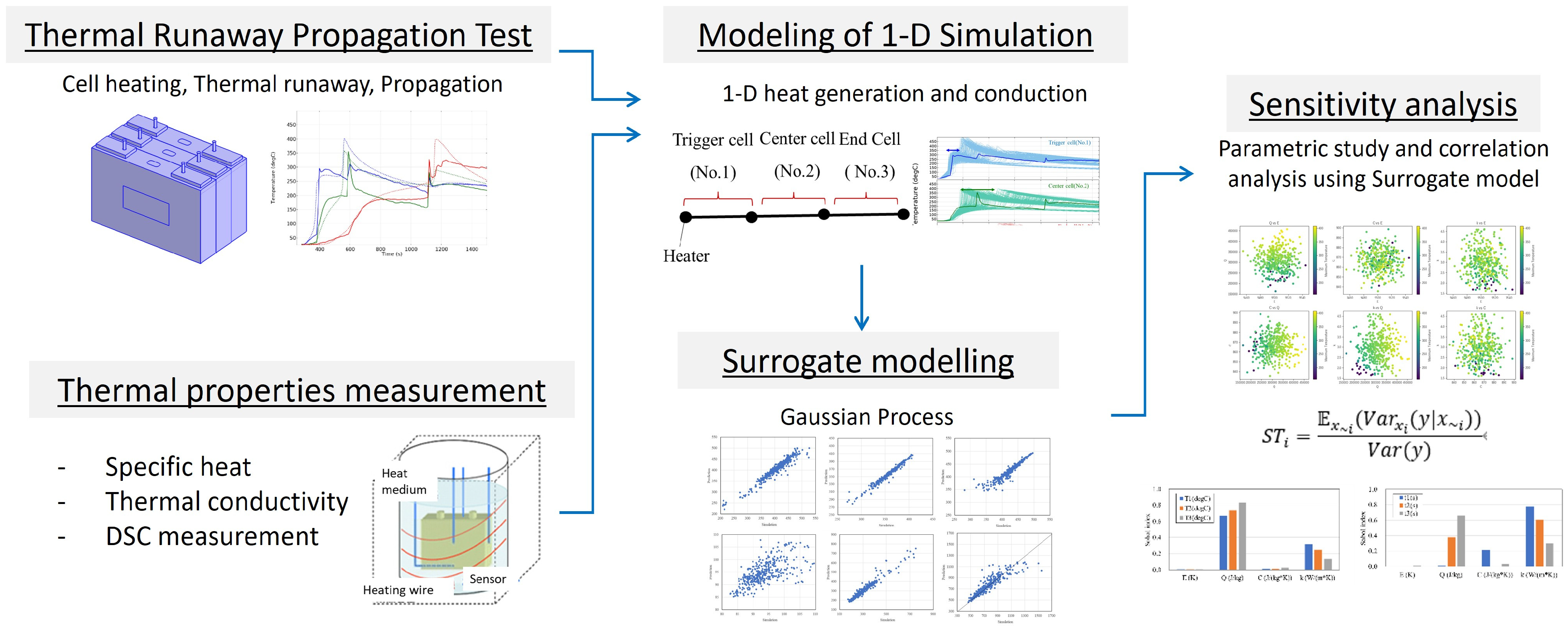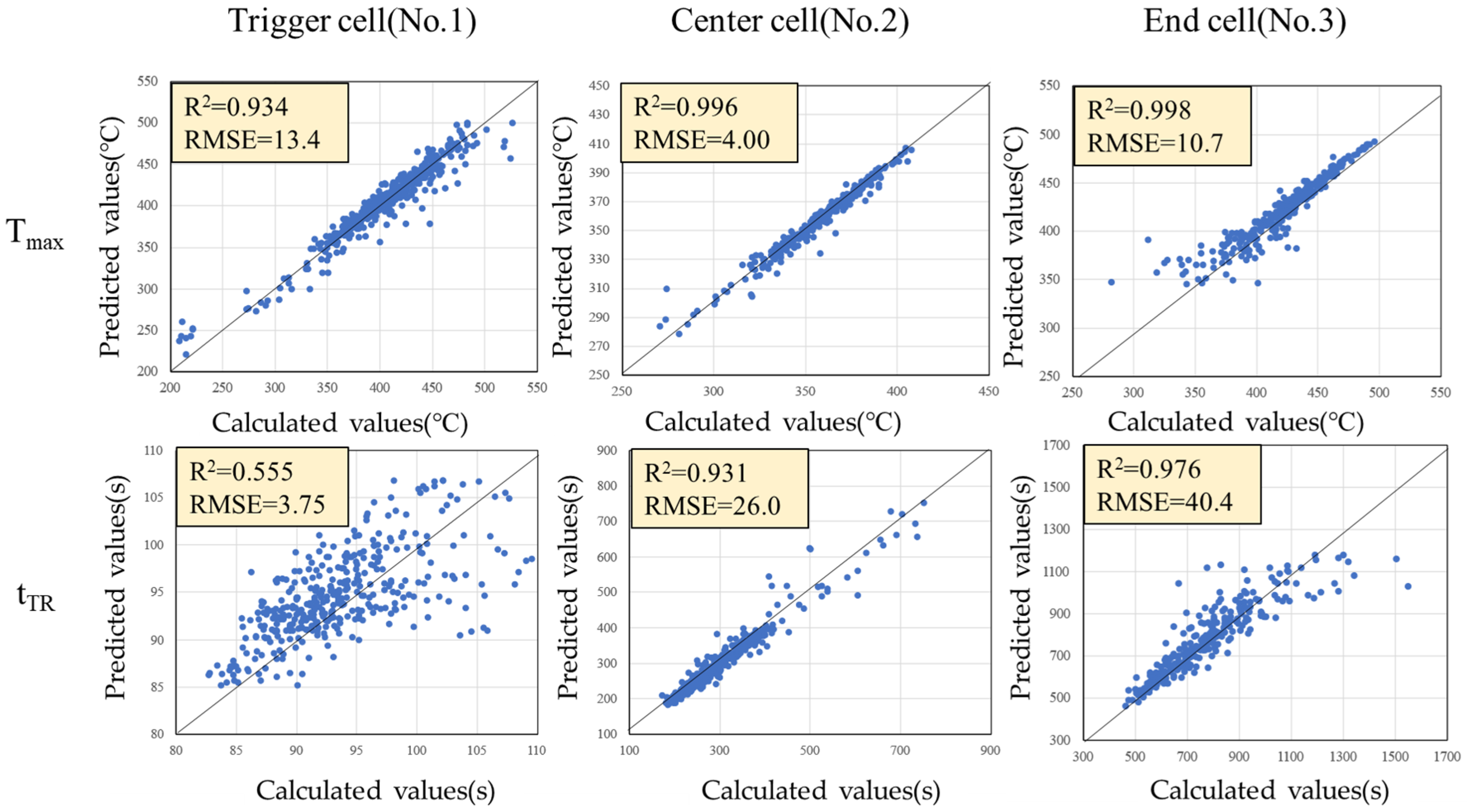 Figure 9 shows scatter plots of the calculated values by the 1-dimensional thermal runaway model and the predicted values by the surrogate model. Each plot is generally on the 45-degree line, and it can be seen that the surrogate model satisfactorily predicts both