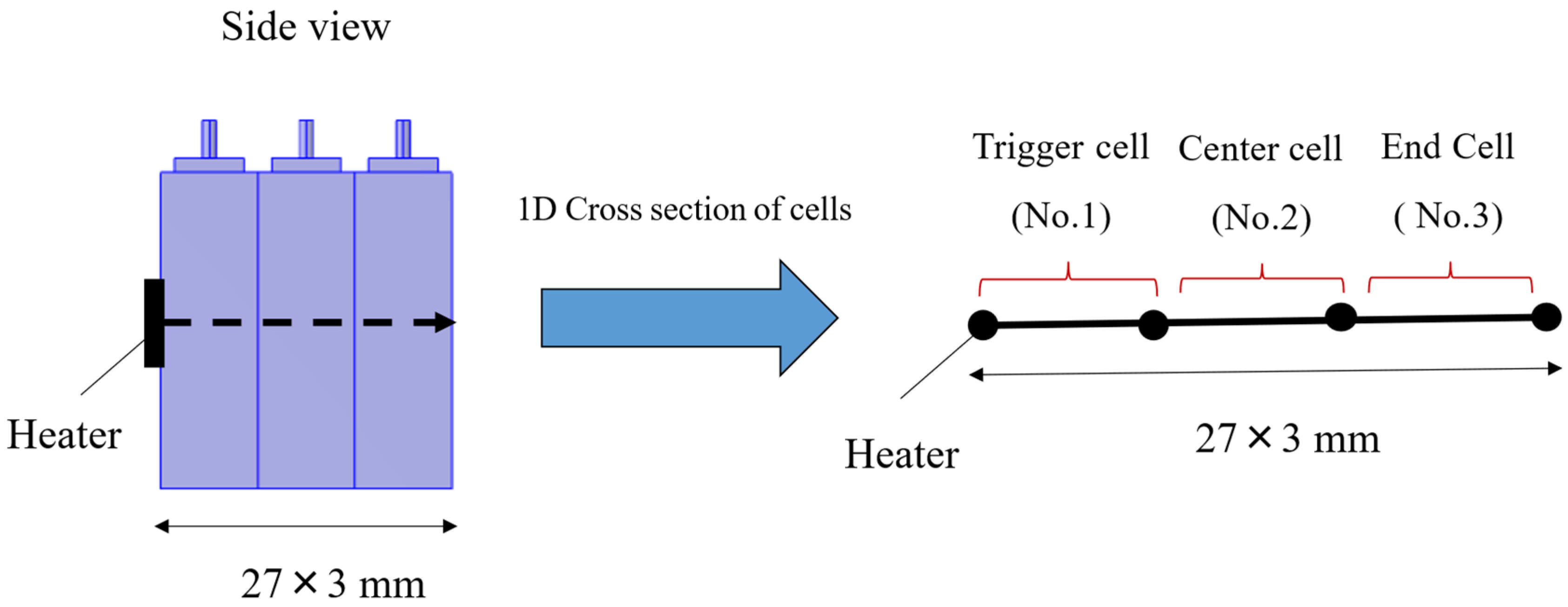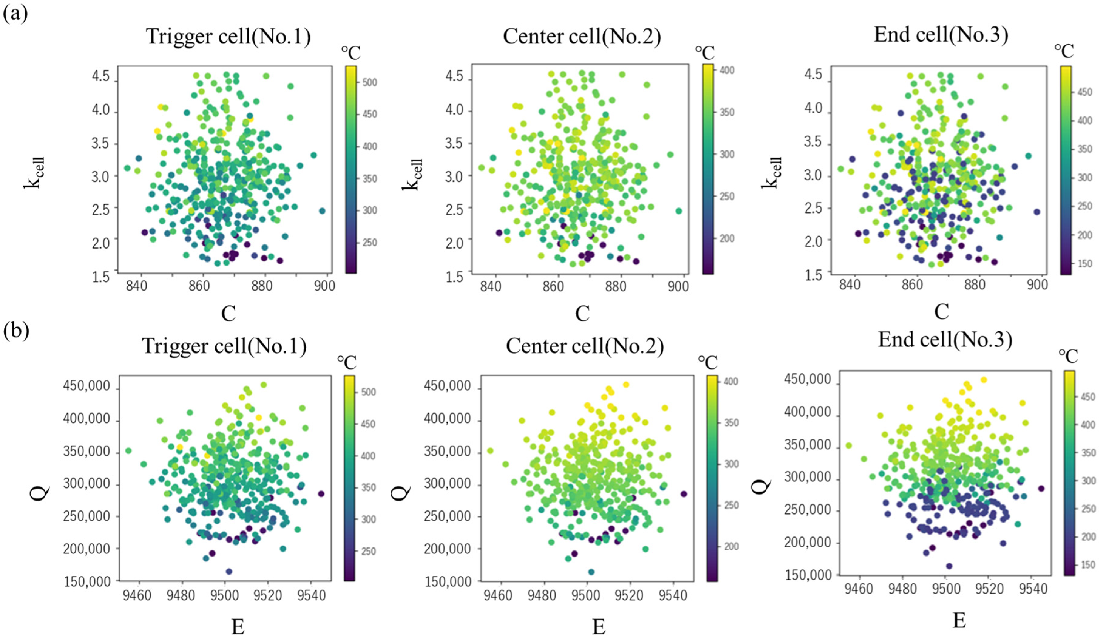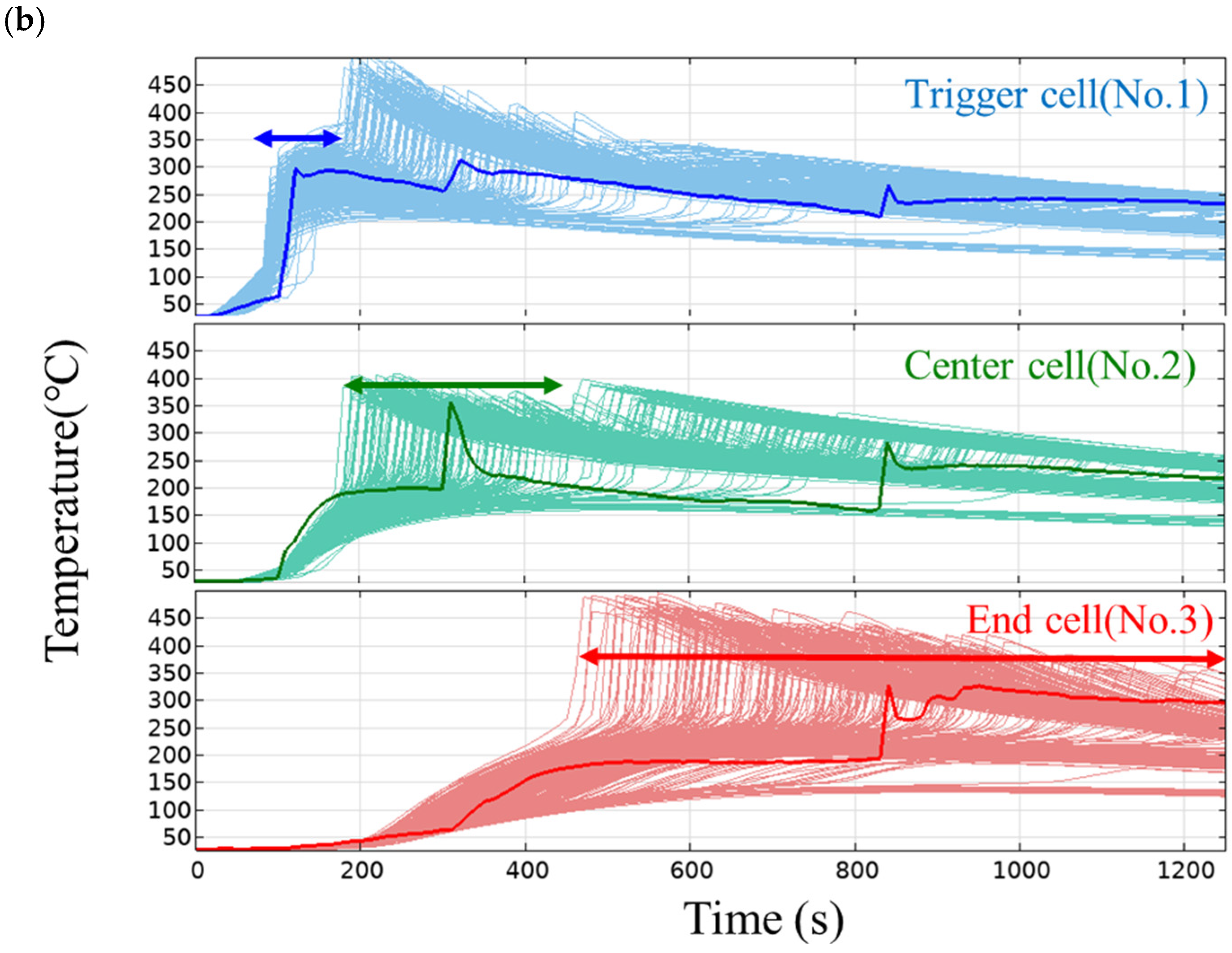 Figure 8a) is delayed in the order of the trigger cell, center cell, and end cell, indicating that thermal runaway is propagating. As mentioned above, the trigger cell has a relatively small variation, but the variation increases as the distance from the trigger cell increases in the center cell and the end cell.