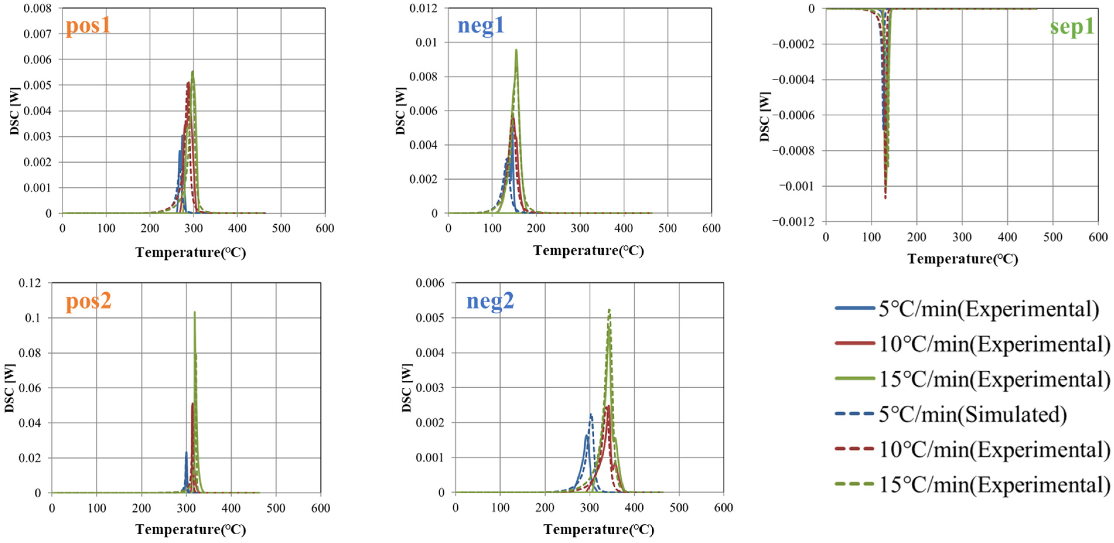 Figure 4 shows the DSC charts of the positive electrode, negative electrode, and separator at heating rate 5 °C/min. Clear peaks due to the thermal decomposition reaction are observed near 300 °C (pos 1) and 320 °C (pos 2) in the positive electrode. On the other hand, sharp peaks are observed near 160 (neg 1) and 340 °C (neg 2) in the negative electrode, which are presumed to be SEI decomposition and negative electrode–electrolyte reaction from the low-temperature side. An endothermic peak is observed near 130 °C (sep 1) in the separator, indicating melting of the separator and electrolyte evaporation.