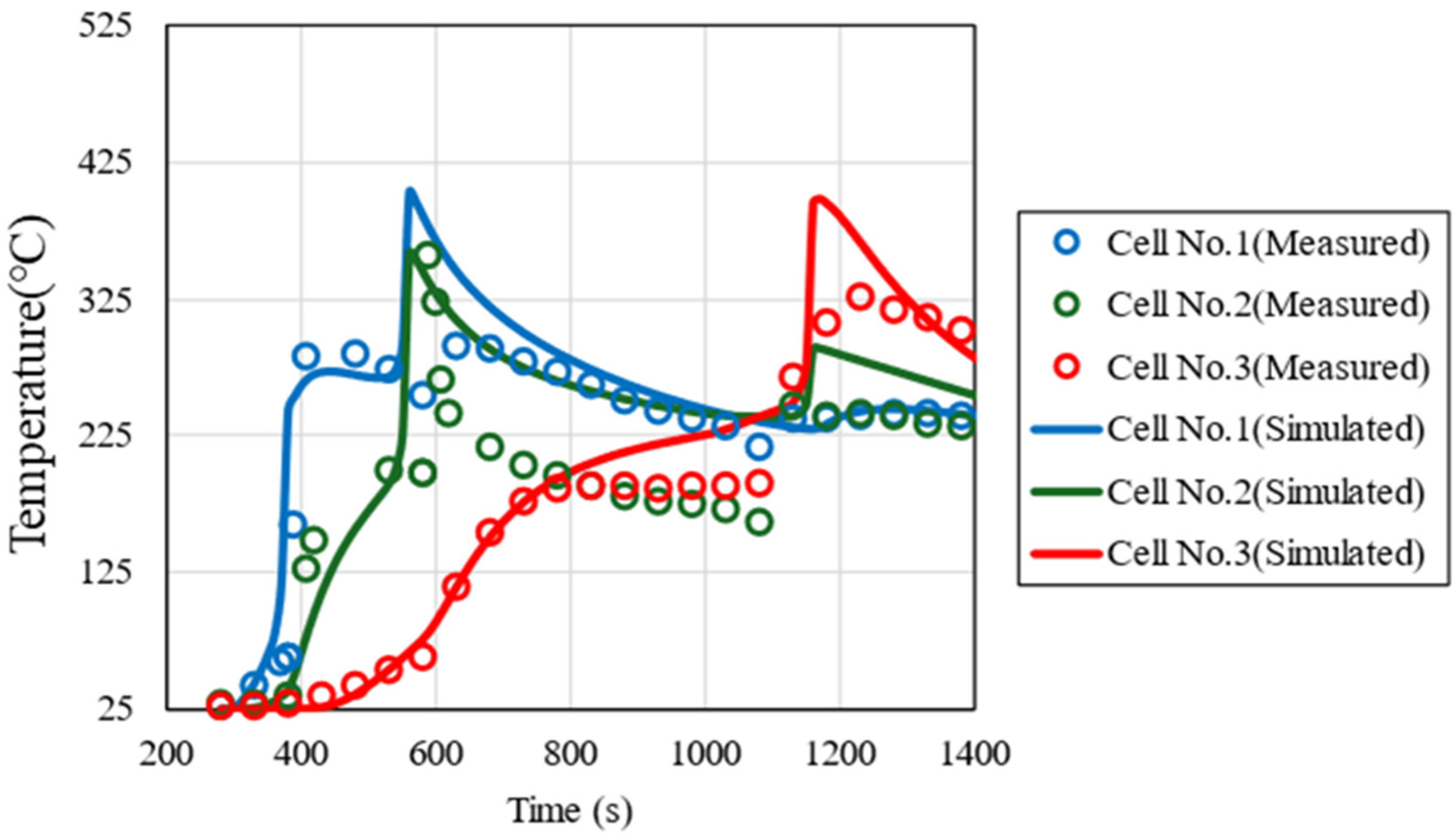 Figure 7b shows the temperature profiles of the trigger cell (#1), center cell (#2), and end cell (#3). In the trigger cell, the measured temperature (thick solid line in the figure) shows a rapid rise in temperature due to thermal runaway at around 100 s, and the simulation also shows a temperature rise at almost the same timing at all levels, that is, the variation is small. This is probably because the thermal runaway timing in the trigger cell is governed by the heat input from the heater and is not affected by variations in the parameters of the thermal decomposition reaction. On the other hand, in the center cell, the measured temperature rises rapidly at around 300 s, while the simulation shows large variations. The reason for this is thought to be that the thermal runaway timing of the center cell is affected not only by variations in the intra-cell thermal conductivity and specific heat but also by variations in the parameters of the thermal decomposition reaction. In the end cell, the thermal runaway timing in the simulation varies even more, which supports this hypothesis.