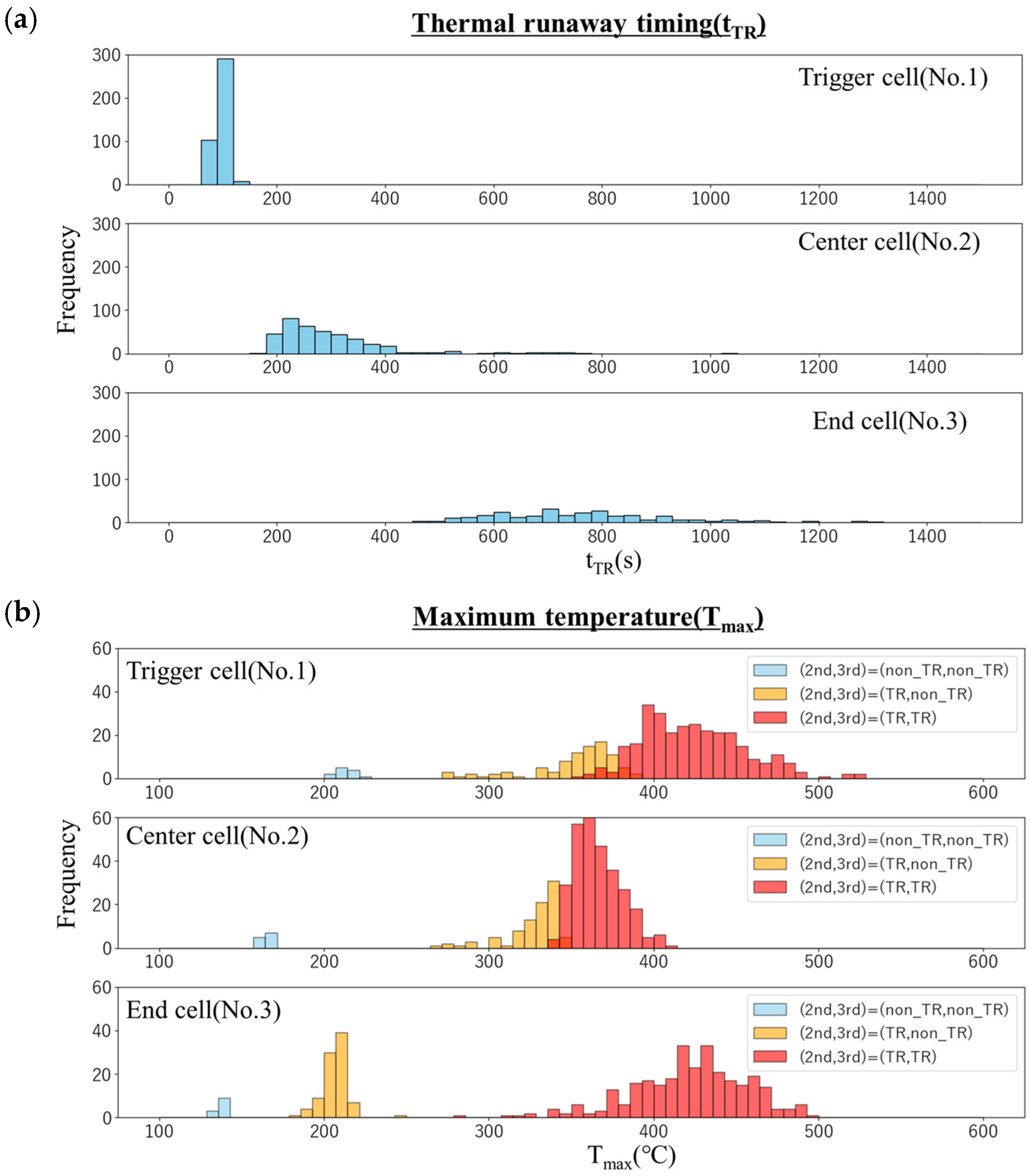 Figure 8b), the light blue bars represent the frequency of cases where neither the center cell nor the end cell underwent thermal runaway (Case-1). The yellow bars show the frequency for cases where the center cell underwent thermal runaway, but the end cell did not (Case-2), and the red bars indicate cases where both cells experienced thermal runaway (Case-3). It should be noted that the trigger cell reached thermal runaway in all cases. In Case-1, the trigger cell reached approximately 200 °C, but the maximum temperature progressively decreased to about 160 °C in the center cell and 140 °C in the end cell. In contrast, for Case-2, both the trigger cell and the center cell reached maximum temperatures of 300–350 °C, while the end cell’s temperature dropped significantly to approximately 200 °C. On the other hand, in Case-3, the trigger cell and the end cell temperatures are high at about 450 °C, and the center cell temperature is relatively low at about 370 °C. Furthermore, in any cell, the variation in the maximum temperature is about 100 °C, and no clear difference was seen. This is interpreted as follows: Since the heater heating continues in the trigger cell, the temperature rises higher due to the temperature rise caused by the thermal decomposition reaction. In contrast, the temperature of the center cell rises due to heat transfer from the trigger cell, but since it is cooled by heat transfer to the end cell, the temperature does not rise so high. The temperature of the end cell rises due to heat transfer from the center cell, but since there is no heat removal to the cell, cooling does not proceed, and as a result, the temperature tends to be high. Also, these are less affected by variations in thermal runaway timing. It should be noted that the probability of “no thermal runaway” in the center cell is about 3% (the light blue bars in the center cell), whereas that in the end cell reaches 25% (the light blue and yellow bars in the end cell). This suggests that the uncertainty of each measured value propagates from cell to cell, and as a result, the presence or absence of thermal runaway is greatly affected.