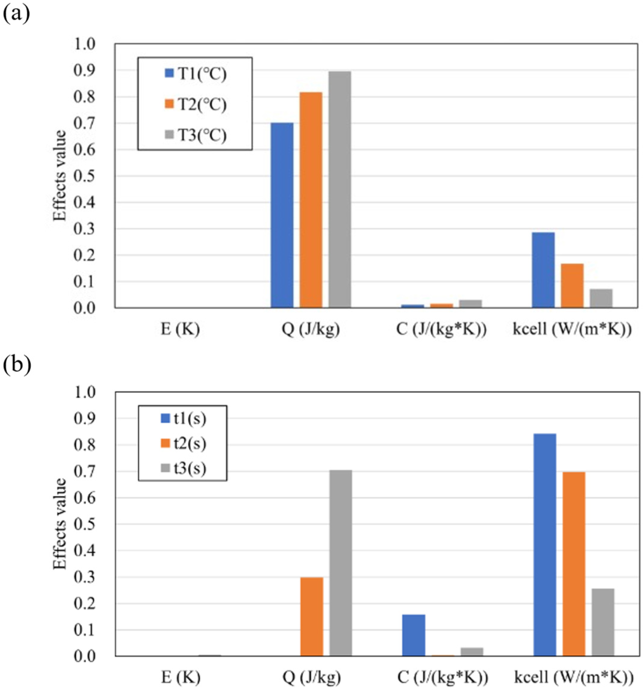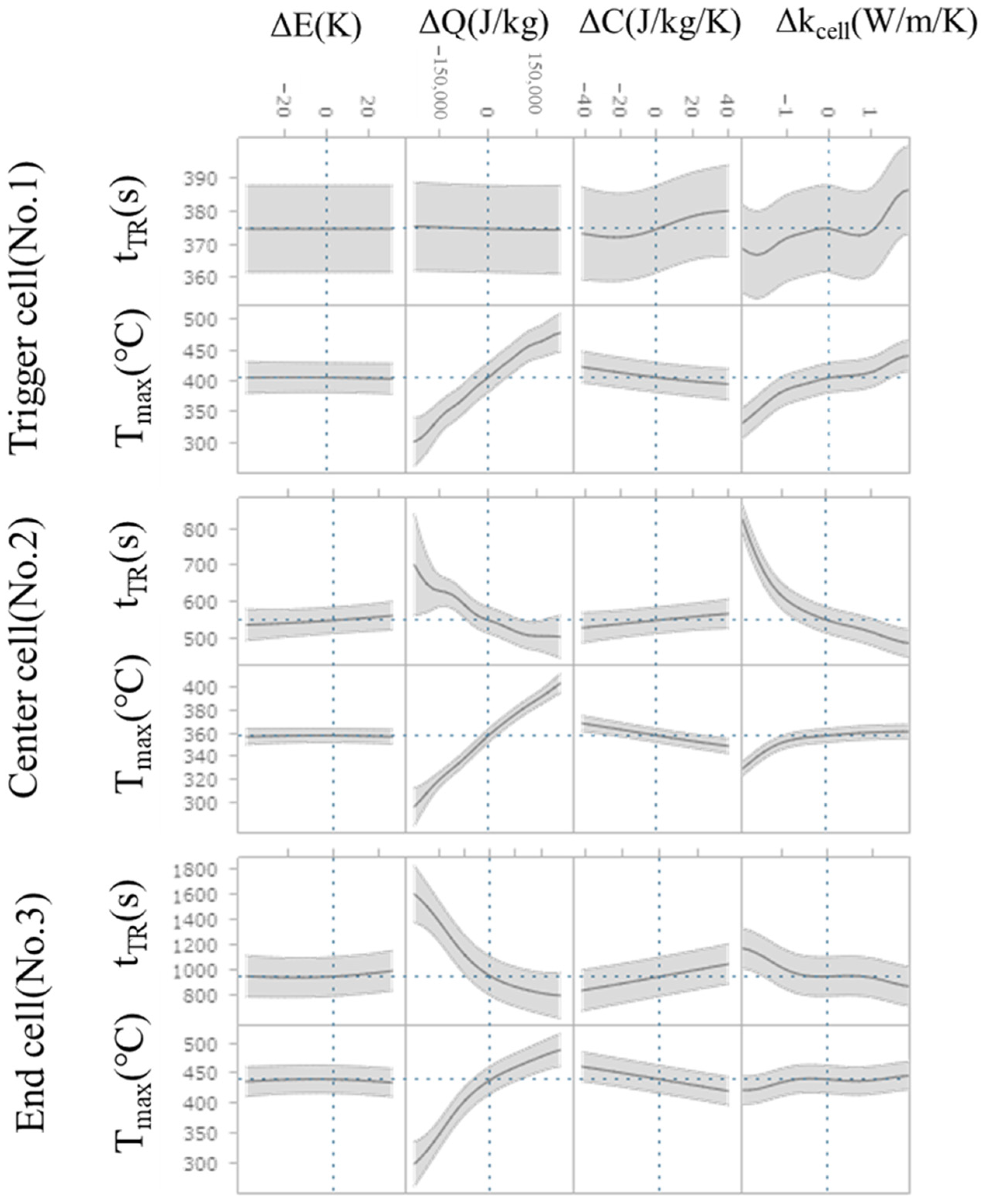 Q is large, and it can be seen that it changes continuously depending on the distance from the trigger cell. This indicates that the heat propagation and the amount of heat generation of the cell affect the temperature-time (position) profile. On the other hand, the Sobol indices (ST values) for the specific heat