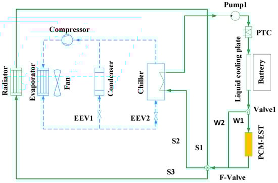The operational logic functions as follows: ① Low Battery Temperature: Heat stored in the PCM-EST (W1 branch) supplements the PTC heater to warm the battery coolant. This reduces PTC power demand while accelerating battery heating. ② High Battery Temperature: When PCM-EST is cool, it absorbs battery heat while simultaneously warming the PCM. When PCM-EST is hot, the radiator is activated (S3 branch) for heat dissipation or the chiller (S2 branch) is engaged for forced battery cooling.