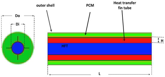 This study employs the PCM-EST to encapsulate the PCM within discrete energy storage units. A key advantage of this approach is that the PCM avoids direct contact with the battery pack. These energy storage units can be integrated with the battery liquid cooling system to provide both cooling and heating functions for the battery pack. The structure of the PCM-EST is illustrated in Figure 2. Comprising four concentric layers from the exterior inward, the PCM-EST consists of an outer shell, the PCM, a heat transfer fin tube, and heat transfer fluid (HTF). Fins are uniformly distributed around the heat transfer tube, and an insulation layer encases the exterior of the tube assembly.