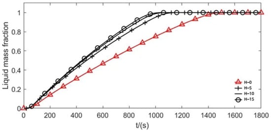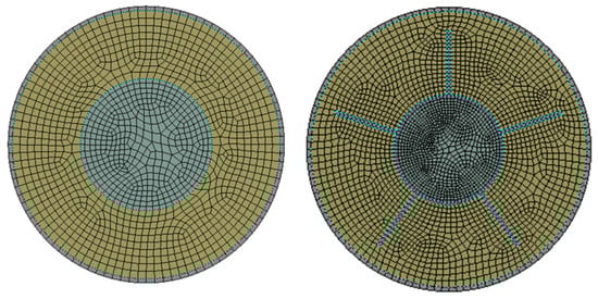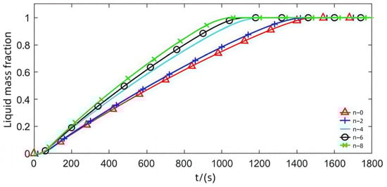 The computational domain was discretized using an appropriate meshing technique, with local mesh refinement implemented near the fin regions. Figure 4 provides a schematic of the mesh topology for the two distinct structures. Mesh independence was verified through a systematic study. Using the baseline energy storage tube configuration (n = 0, H = 0) as a representative case, the liquid phase fraction results were compared across progressively refined mesh densities. Mesh independence is confirmed when the simulation results stabilize, exhibiting minimal variation with further mesh refinement. Conversely, if the results persistently increase or decrease without convergence, the mesh is deemed insufficiently refined, necessitating additional densification.