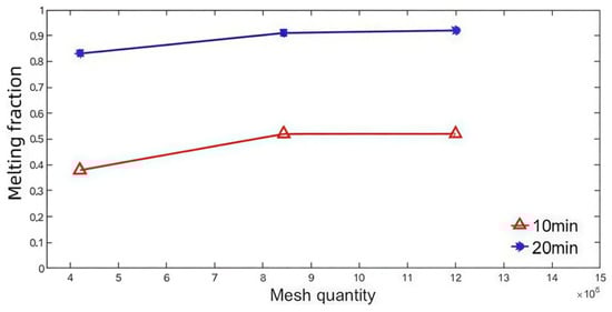 The results are presented in Figure 5. The x-axis represents the number of mesh elements, and the y-axis represents the liquid mass fraction of the PCM within the energy storage tube. The figure displays the liquid mass fractions at 10 min (red) and 20 min (blue) for three distinct mesh densities: 4.2 × 105, 8.5 × 105, and 12.5 × 105 elements. Comparing the simulation results across the three mesh densities reveals that the coarsest mesh (4.2 × 105 elements) yields less accurate results. In contrast, the results obtained with the finest mesh (12.5 × 105 elements) are nearly identical to those using the medium mesh (8.5 × 105 elements). However, the element count of the finest mesh is approximately 1.5-times higher than that of the medium mesh, significantly increasing computational cost. Given that excessively high mesh counts impair computational efficiency without substantially improving accuracy beyond the medium mesh, the medium mesh density (8.5 × 105 elements) was selected. This choice ensures a balance between simulation accuracy and computational efficiency. Therefore, the optimal mesh size for the phase-change unit in this study is approximately between 8.5 × 105 and 9.5 × 105 elements.