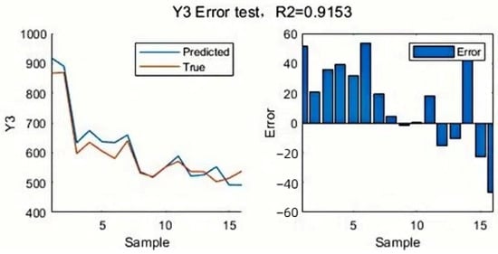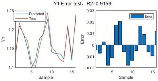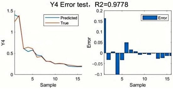 Utilizing the parameters defined above, the corresponding Kriging surrogate model was constructed, and its associated error analysis plots were generated. These plots are presented in Figure 12, Figure 13, Figure 14 and Figure 15. For each figure, the left panel displays the surrogate model’s predicted values versus the actual (or real) values, while the right panel presents the corresponding error values as a bar chart.