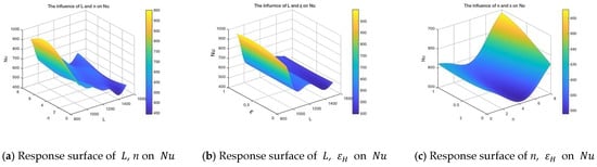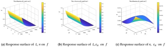In Figure 17, the analysis of the three variables on the three-dimensional response surface reveals that as increases, the resistance coefficient inside the pipe decreases, and the effect is significant. This is related to the increase in the heat transfer pipe diameter with the increase in under a fixed volume, as described in Equation (16). Additionally, the figure shows that the influence of L and n, on is relatively small and can almost be neglected.