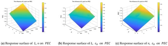 In Figure 18, it can be observed that the value of depends on both and . Combining the influences of the three variables on and , it can be seen that as increases, decreases, but also reduces overall. Additionally, the variable n, is positively correlated with , while has little to no effect on it. Based on Figure 17, the relationship between the variables and is consistent, following an overall trend. From the figure, it can be roughly determined that when the values of are maximized, , n, and tend to approach the upper limits of their respective ranges.