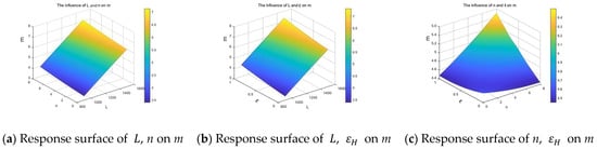 Based on the surrogate model mentioned above, the response surfaces of the design variables ((), (n), ) and the independent variables (, , , m) are plotted. These response surfaces provide a clear visual representation of how the design variables impact the dependent variables, making it easier to observe their influence trends. This analysis will provide guidance and direction for subsequent structural optimization.