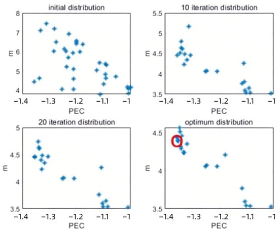 The Kriging surrogate model constructed based on Section 4.2.2 above uses the MOPSO algorithm to find the optimal solution with the objectives of and . The iterative process is shown in Figure 20 (The region marked with the red circle in Figure 20 represents the final, optimized result from our iterative process).