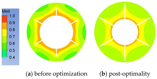 In the process of using MOPSO to find the optimal surrogate model, the surrogate model’s solution is based on the predicted values rather than the direct CFD results. To ensure the accuracy of the optimal solution, a 3D model is constructed based on the parameters of the variables obtained from the solution set (x1 = 930 mm, x2 = 6, x3 = 0.8954). The original design structure, as described in Section 3.3, has parameters ( = 1200, n = 6, = 0.485). The CFD results for the two structures were compared and computed in ANSYS, as shown in Table 9. The comparison of the PCM melting mass fraction at the outlet of PCM-EST before and after optimization is presented in Figure 21.