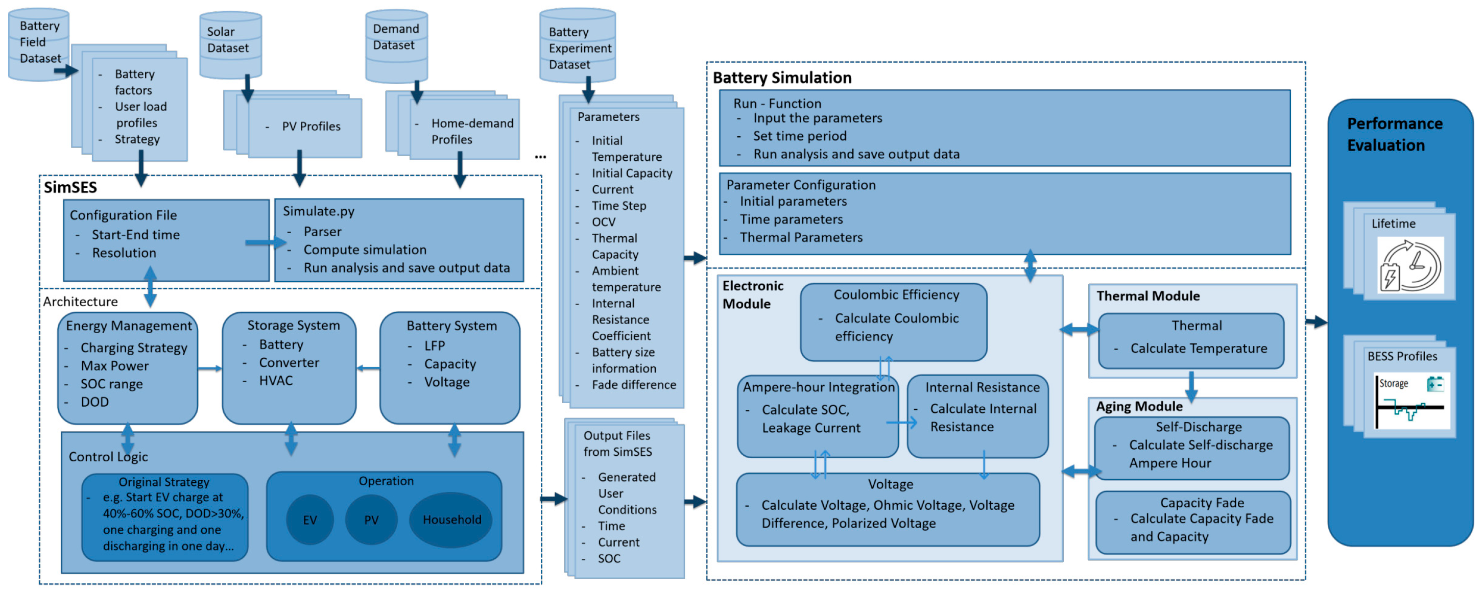 - Aging module: Semi-empirical degradation sub-models based on cycling and calendar effects.