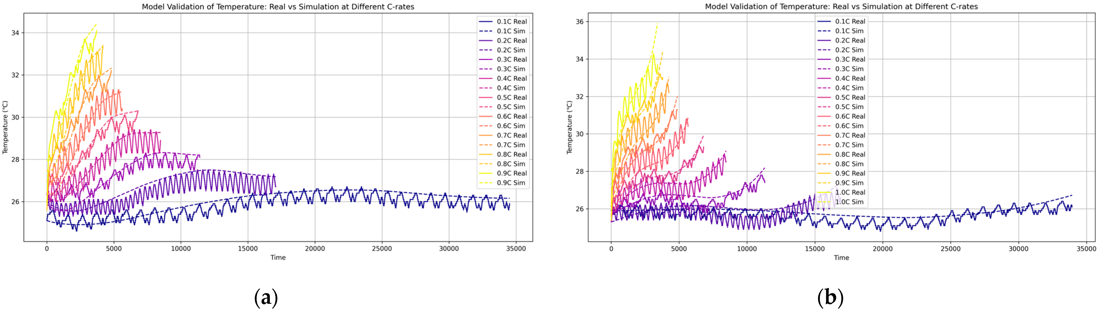 Figure 4 illustrate representative comparisons of voltage and temperature profiles under different C-rates for both charging and discharging. The simulation captures key dynamic behaviors, such as voltage plateaus and thermal rise, with strong consistency across SOC levels and current conditions.