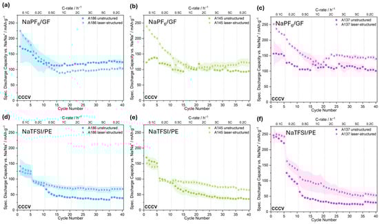 These combined results highlight how the impact of laser structuring on electrochemical performance is highly dependent on the combination of the electrolyte and separator, especially in terms of wettability and viscosity. In systems with glass fiber (GF) separators, which have high porosity and excellent wettability, the benefits of laser structuring, such as improved electrolyte filtration and rewetting, are largely attenuated. This explains the comparably small effect with the NaTFSI/GF and NaPF6/GF cells. The higher viscosity and lower wettability of the NaPF6-based electrolyte can still restrict ion transport within dense electrode structures, which is an advantage of the structuring. In contrast, PE separators with ceramic coatings are less wettable, resulting in poor electrolyte contact, especially with the more viscous NaPF6 system, which fails under these conditions. However, the NaTFSI electrolyte, which has a lower viscosity and better wetting behavior, works well with PE, and structuring significantly improves performance by creating channels that facilitate access for the electrolyte and mitigates the poor wettability of the separator. These results demonstrate the importance of compatibility between the electrolyte and separator and the role of laser patterning in improving performance when wetting is a limiting factor.