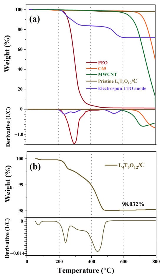 TGA (Figure 3) was performed on both the pristine components and the composite LTO fiber mat to determine active material loading. The profiles of the materials and their derivatives revealed that PEO undergoes complete decomposition at 450 °C, while C65 and MWCTs exhibit thermal stability up to 600 and 700 °C, respectively (Figure 3a), consistent with data reported in the literature [40,41,42]. Pristine carbon-coated LTO/C (Figure 3b) shows minimal weight loss across a wide temperature range, confirming its high thermal stability. Minor weight losses between 200–300 °C and 350–500 °C are attributed to carbon burn-off in ambient air, with a total carbon content of 1.97 wt% [43,44].