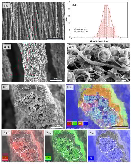 Morphological and elemental characterization of the electrospun LTO fibers. (a.i) SEM micrograph showing uniform fibrous architecture. (a.ii) Fiber diameter distribution (a.iii) SEM micrograph of a single fiber surface (a.iv) nanoscale view highlighting the porous texture and the particles distribution (b) Fiber’s cross-section obtained using the FIB: (i) HRSEM micrograph displaying the internal morphology. (ii) EDS elemental mapping overlay highlighting the distribution of C (red), O (green), and Ti (blue), with white dotted outlines marking two distinct fibers, and W (orange) indicating the residual tungsten protective layer. Individual element maps for (iii) C, (iv) O, and (v) Ti, demonstrating the spatial distribution of key elements within the fibers.