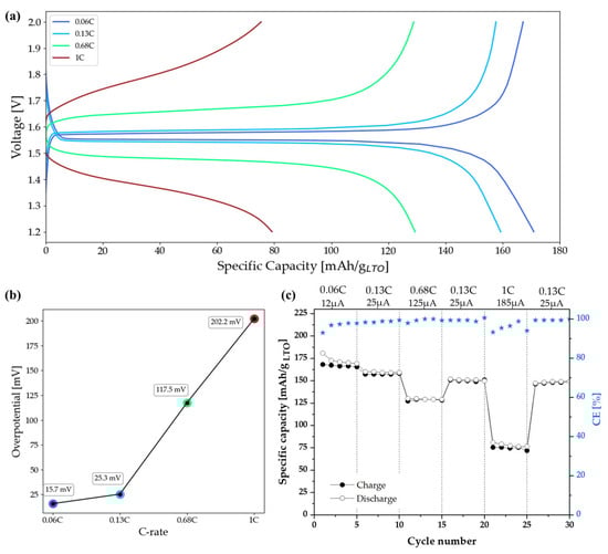 Electrochemical performance of electrospun LTO cells. (a) Voltage-specific capacity profiles at different C-rates, illustrating rate-dependent electrochemical behavior (b) Overpotential evolution as a function of the C-rate (c) Galvanostatic charge–discharge cycling at different current densities with coulombic efficiency (CE) shown as blue stars.