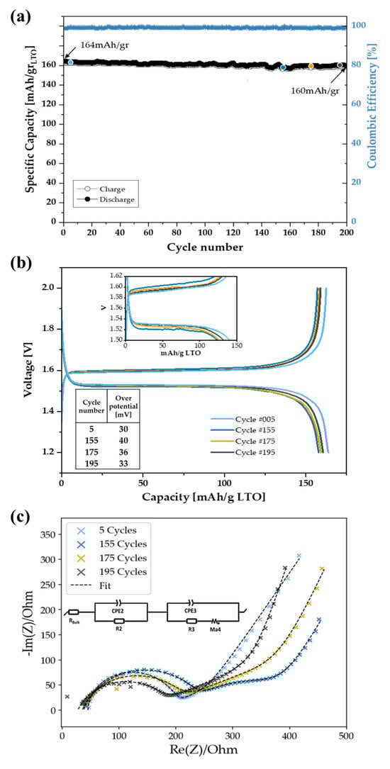 Cycling stability at 0.1 C (Figure 7a) demonstrated stable and high long-term performance, with 160 mAh g−1 retained after 200 cycles, corresponding to a negligible capacity loss of 0.01% per cycle and total capacity loss of 1.83%. The coulombic efficiency consistently remained close to 99.6%. This stability reflects both the intrinsic zero-strain property of LTO and the structural cohesion of the electrospun network, which remained intact. EIS measurements were performed at selected stages during the long-term cycling (Figure 7c). Measurements were first conducted after 5 cycles and then after 155 cycles to evaluate stability over extended operation. Beyond this point, EIS was recorded every 20 cycles. All spectra were collected after discharge, following a one-hour rest period to ensure relaxation.