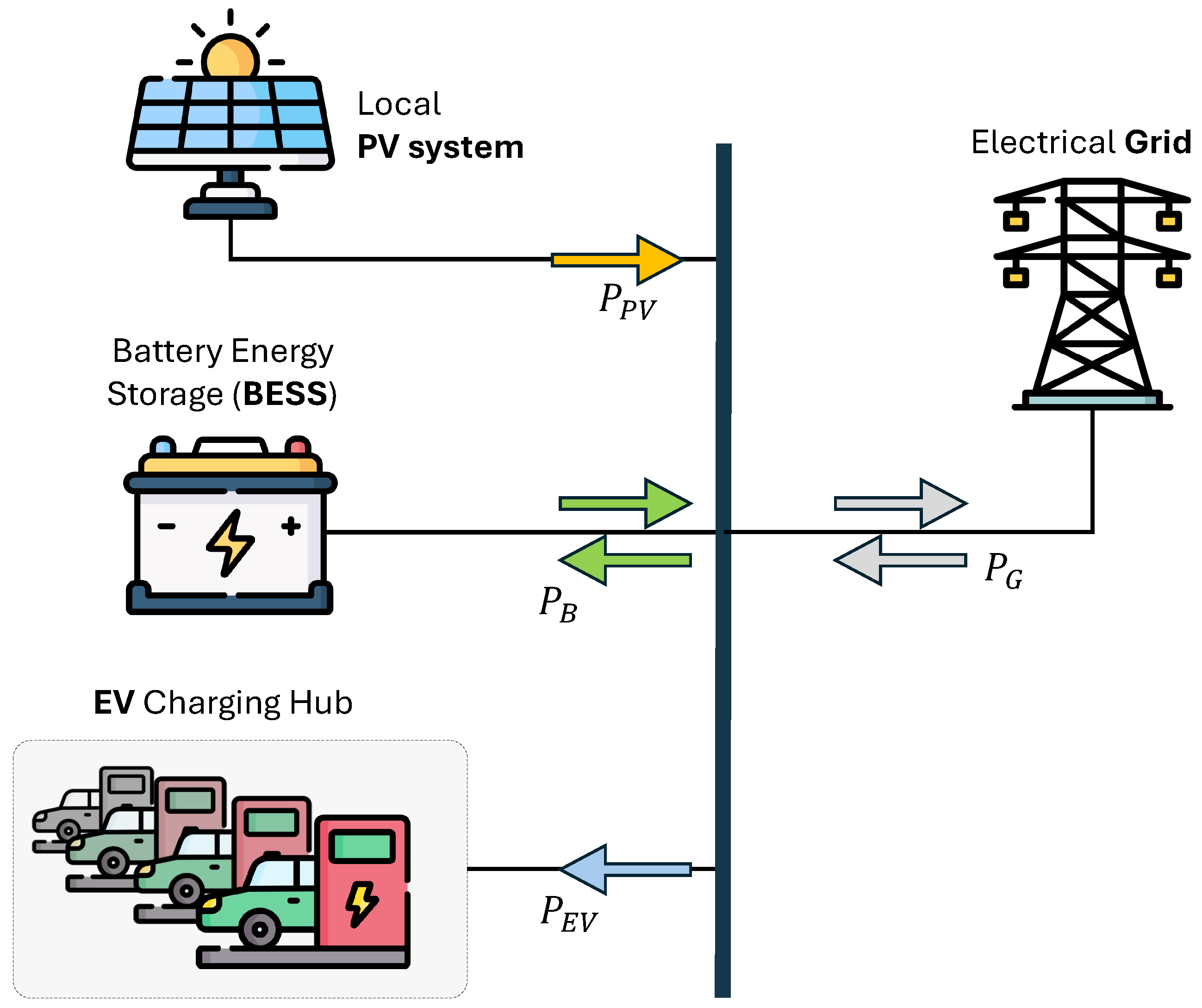 as a buffer between generation and load. The system elements are connected and exchange power with the external grid, designated as