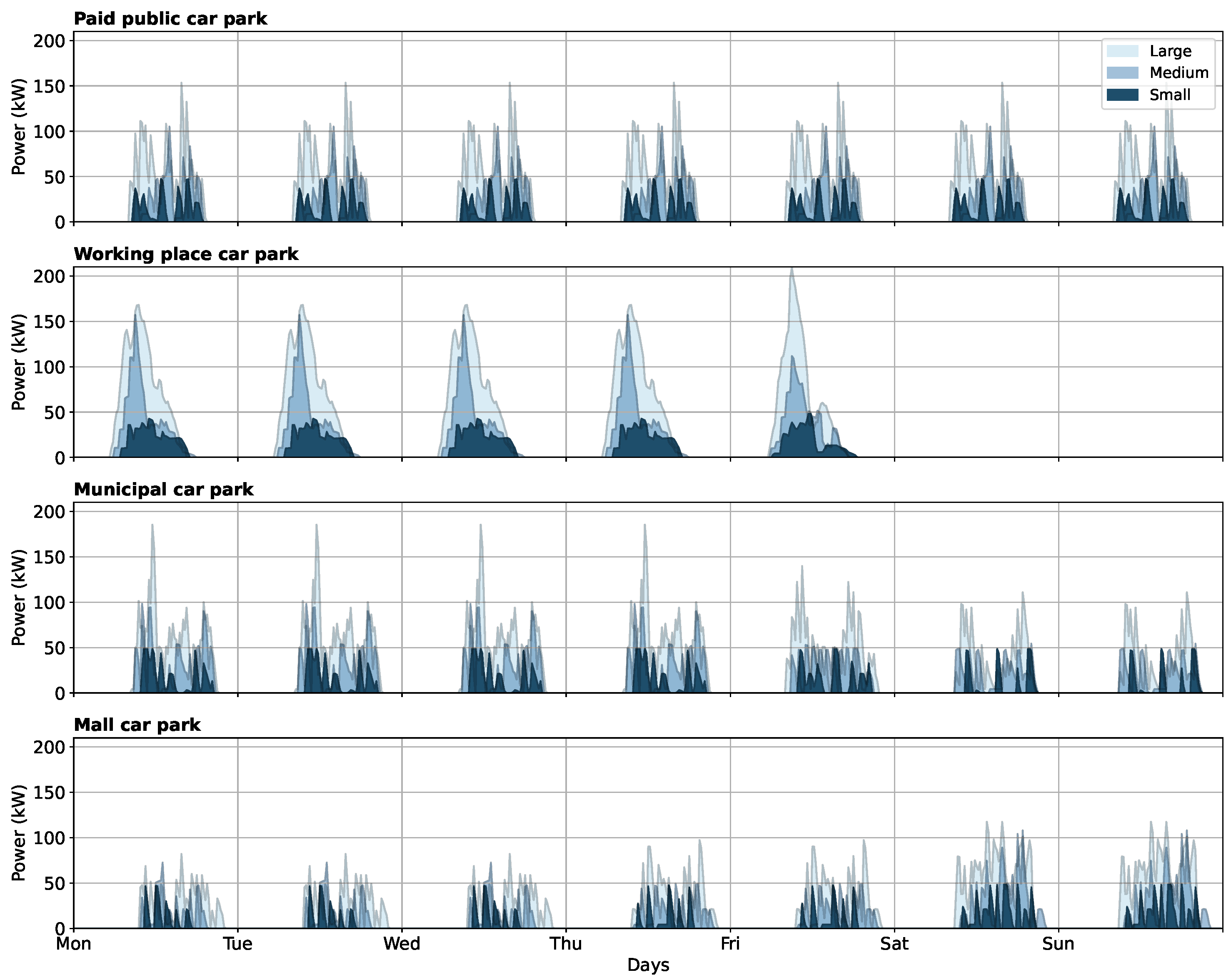 The results obtained can be summarized as follows. The paid public par park achieves the best overall performance, with economic savings of up to 46%. The system is highly self-sufficient, minimizing grid reliance, and its consistent load profile throughout the week leads to efficient system sizing. The workplace car park also demonstrates excellent economic savings, up to 52%, but low energy performance, especially in medium and large scenarios due to the high peak load in the morning and the lack of load at weekends. The municipal car park has lower economic savings, never exceeding 34%, despite having similar energy performance to the public car park. This is because more battery storage is required to meet evening load demands, increasing costs and reducing performance. Finally, the mall par park shows the weakest overall performance, while it achieves good energy performance, it requires a significantly larger battery to cover evening peak loads, leading to higher costs.