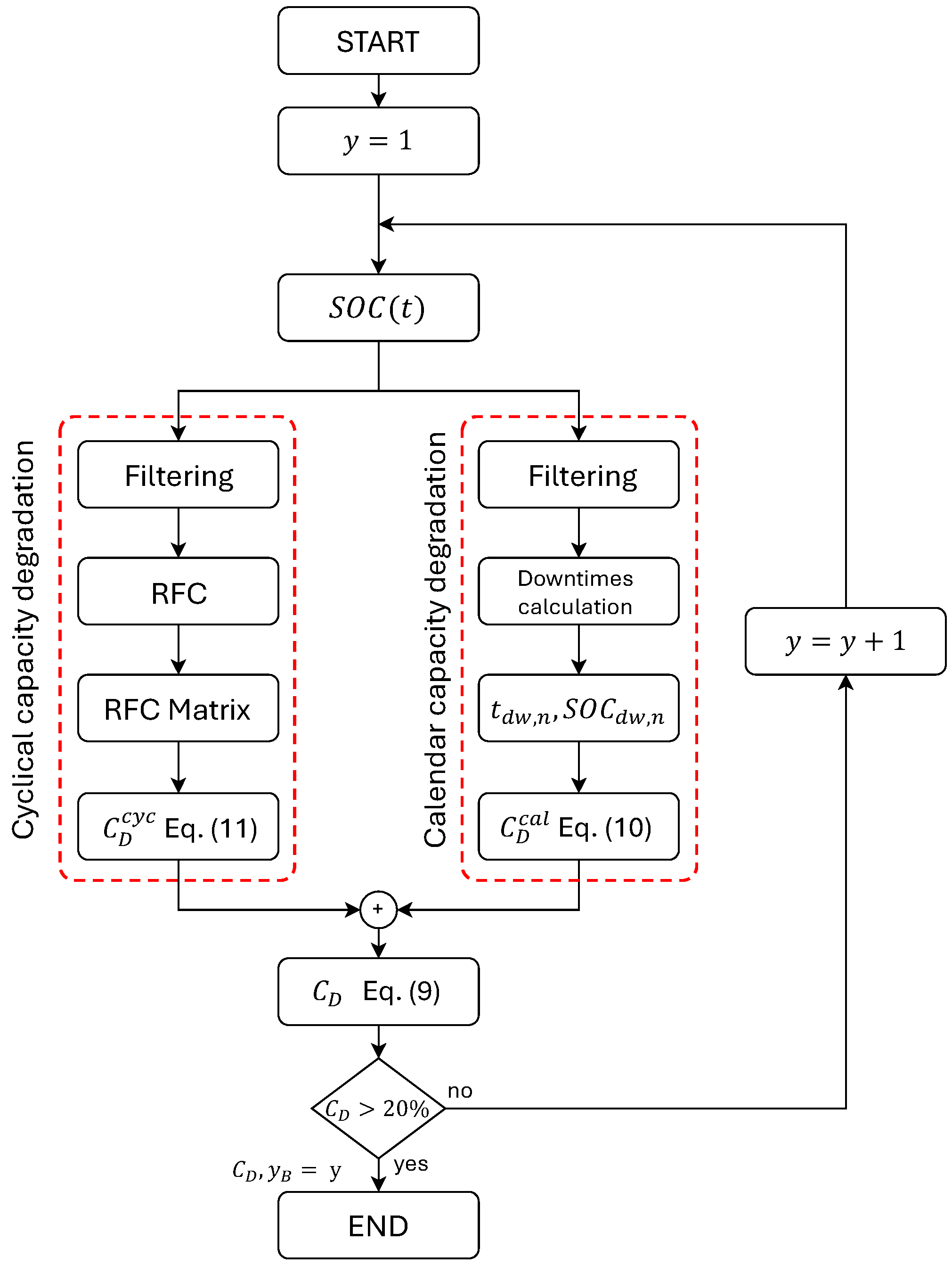 17], in addition to cyclic degradation, propose a model where calendar degradation is treated as a fixed parameter, set at 2% per year, while this approach simplifies the analysis, it overlooks the potential fluctuations in calendar degradation that may arise from operational factors, thus failing to capture its variability over time. In conclusion, generally, BESS lifetime loss is ignored or simplified in several studies concerning the sizing of PV-BESS systems integrated with EV charging hubs. However, since the BESS replacement cost represents a significant expense over the system’s lifetime, it is necessary to establish a precise BESS model that takes into account this loss.
