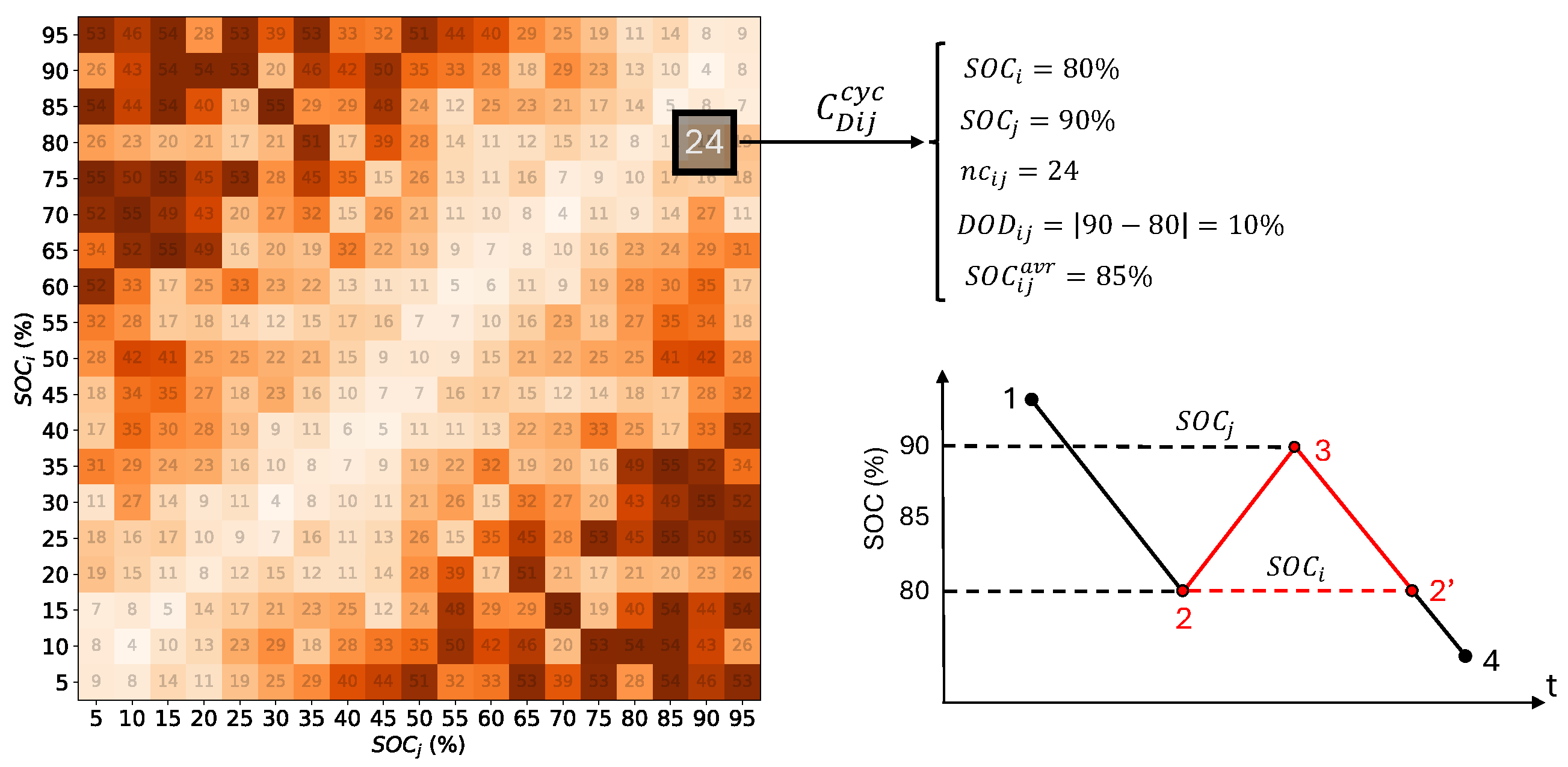 20], the battery lifetime is estimated using a simplified approach that calculates the number of cycles based on cumulative SOC variations and a fixed depth of discharge of 80%. The battery is considered exhausted once the number of cycles reaches 3000, while this method is computationally efficient, it lacks accuracy as it does not account for variations in depth of discharge across different cycles, which have a varying impact on the overall battery lifetime. The model calculates cyclical degradation, but in addition to usage cycles, battery degradation is also influenced by periods of inactivity during which the battery is not in use. This type of degradation is known as calendar aging, and it is influenced by factors such as temperature, downtime duration, and state of charge during downtimes, further impacting the overall battery life. In this sense, the authors in ref. [