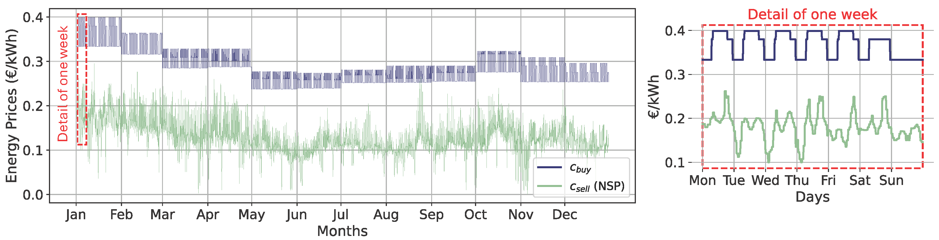 Section 2.3 addresses the BESS operation with 15-min resolution for a one-year time range. In addition to analyzing power flows, it is essential to examine the price values of the energy exchanged with the external grid in order to conduct a comprehensive economic assessment. Finally, to obtain meaningful economic results from the optimization algorithm, the energy price profiles and consequently the grid energy cost model are developed in