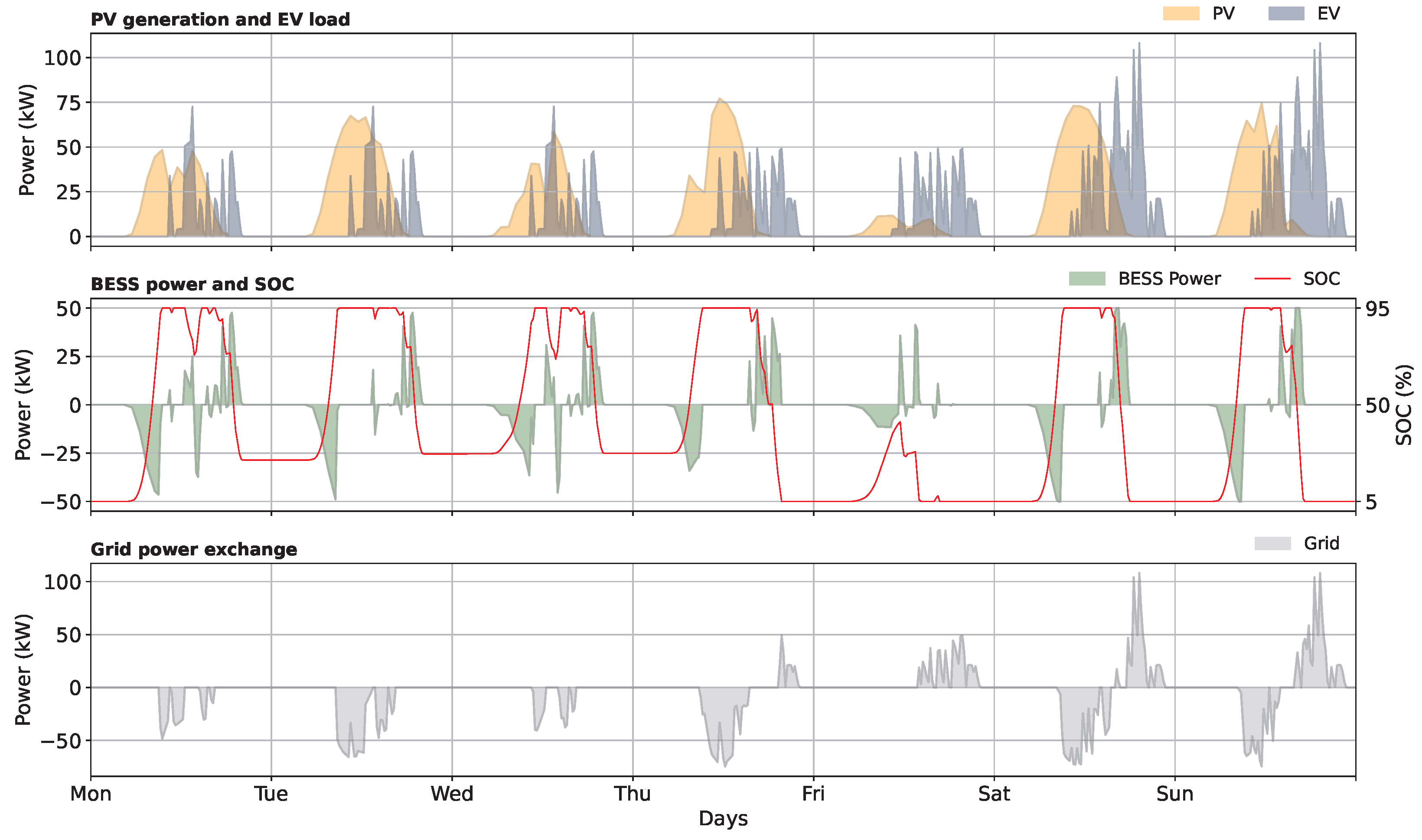 Figure 3, the peak load in this scenario is modest, since the number of vehicles daily charged is small. In this case, the PV and BESS systems are more effective in meeting the demand, as the smaller battery is better suited to support the load, compensating for the reduced self-consumption during the weekends.