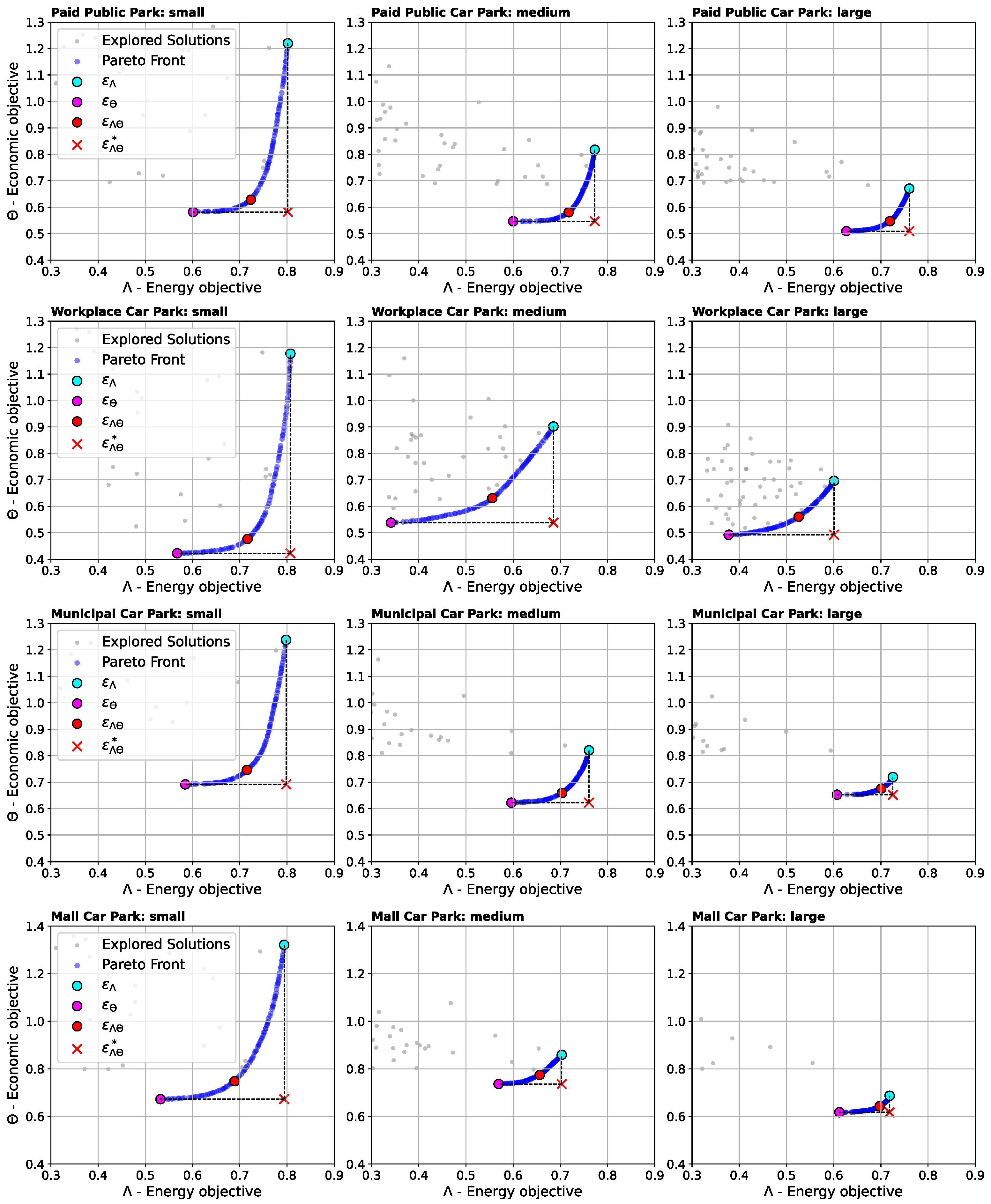 Figure 8 presents the Pareto fronts for the four different parking locations under the three sizes, small, medium, and large, arranged from left to right. The points of interest on the Pareto front, such as