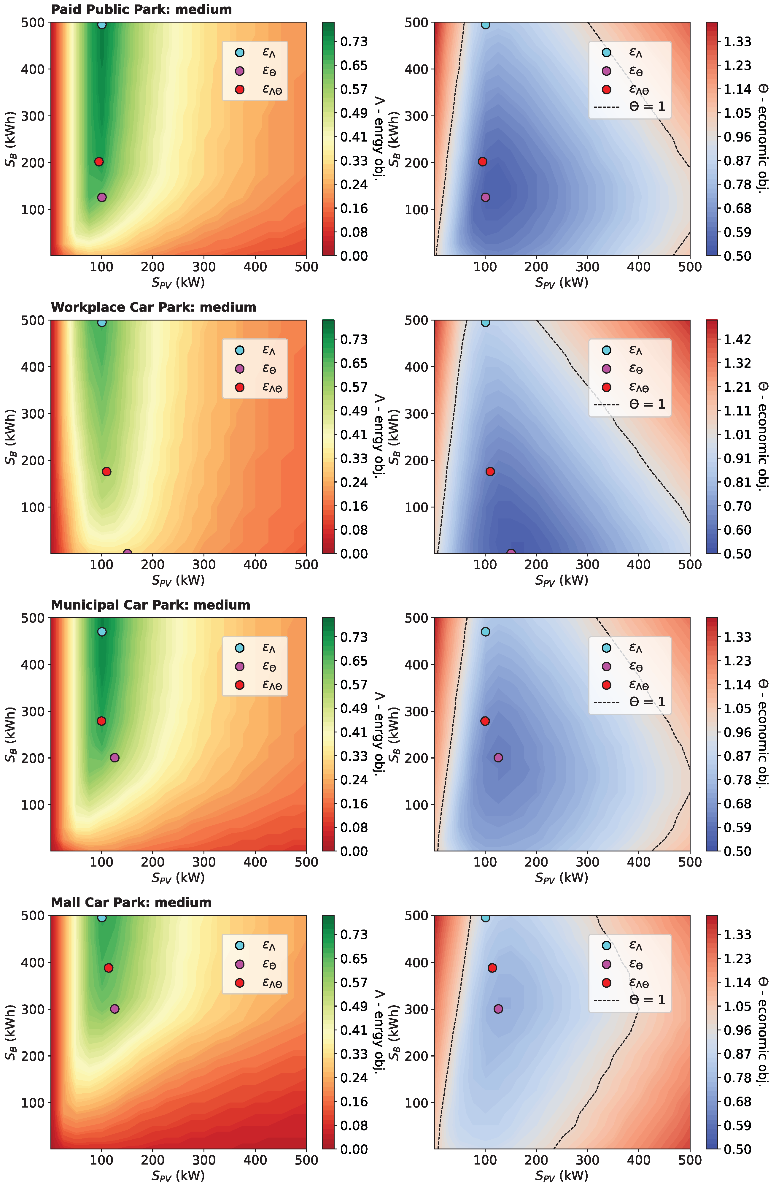 Figure 9 confirm that, the overall best performance are achieved by the paid public car park. High energy performance are achieved for a wider range of BESS sizes, as indicated by the broad green area. In the economic heat map, low energy costs are achieved, while overall economic efficiency is maintained across almost the entire domain, as