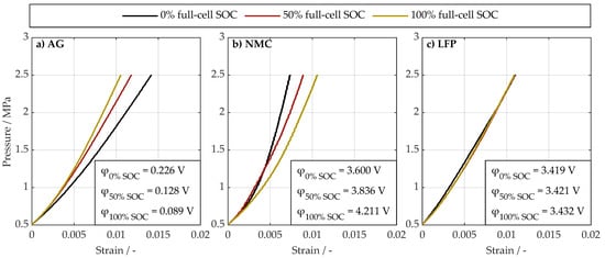 Figure 2 shows the results of the compression tests for the AG anode, the NMC811 cathode, as well as the LFP cathode as a stress–strain diagram. The correction curve to compensate for the compressibility of the pouch bag and the machine stiffness is already accounted for here. Different lines indicate the different SOCs. The half-cell electrical potential (φ) vs. lithium metal is shown in the legend for each full-cell SOC.
