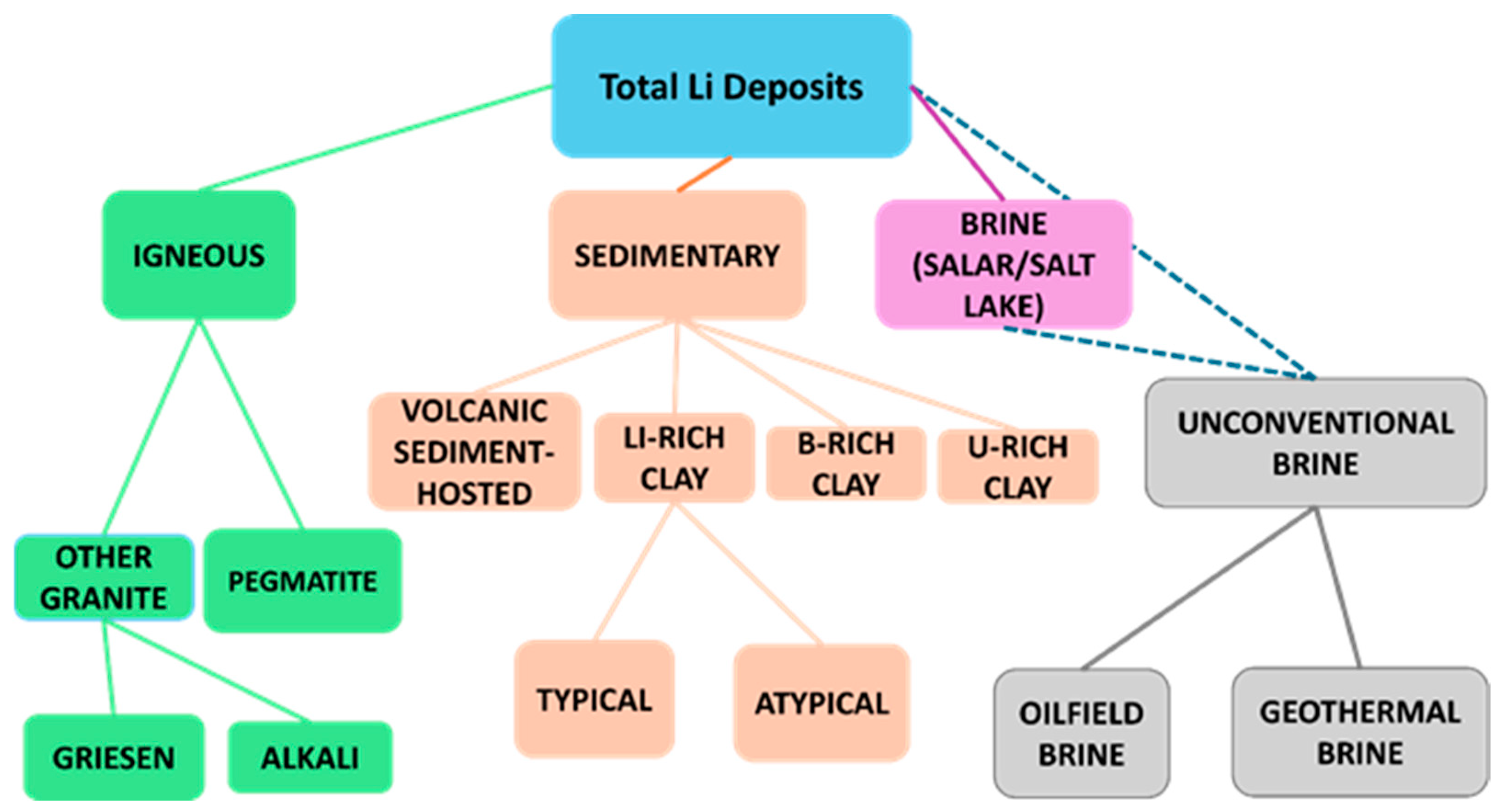 There are three main types of lithium deposits, as shown in Figure 2: (a) Pegmatite (hard rock) deposits, which originate from igneous rocks; (b) Brine deposits, found in salars, salt flats, and evaporative basins; and (c) sedimentary (clay-hosted) deposits, located in volcanic or sedimentary basins [8].