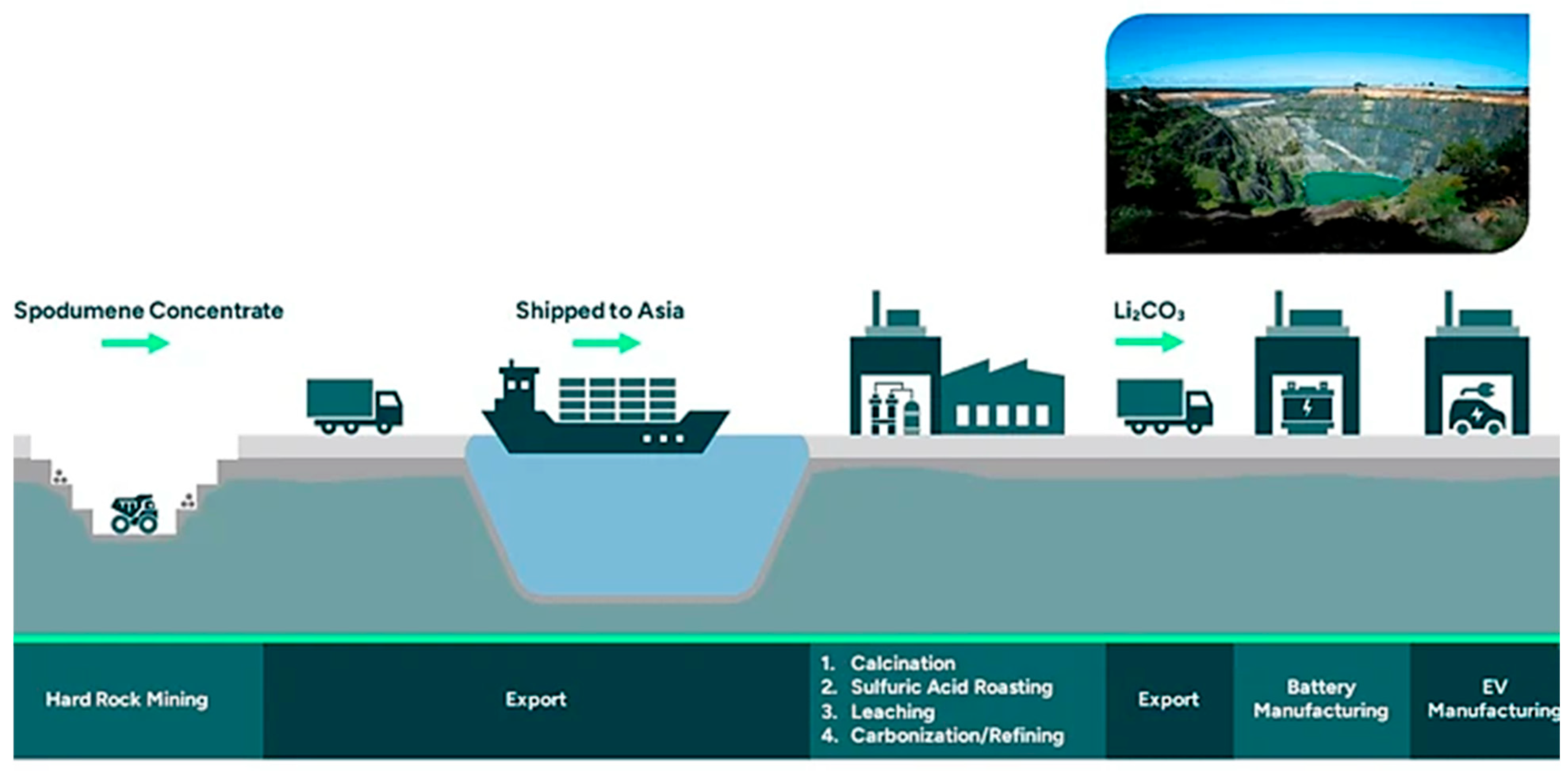 Before 2018, lithium in brine deposits found in the Lithium Triangle was preferred because of its large reserves, lower operational costs, and easier extraction through evaporation ponds [10]. However, the extended project timelines (approximately 6 to 10 years) and increasing environmental and regulatory constraints on brine extraction shifted the industry focus from brine to hard rock mining as demand for lithium skyrocketed. Thus, allowing faster project completion (3–5 years), better scalability for industrial supply chains, and more predictable supply. Australia emerged as the dominant global producer, with the Greenbushes mine holding the largest and highest-grade spodumene deposit [7,11,12]. Table 1 summarizes the geological, economic and environmental influence of deposit types.