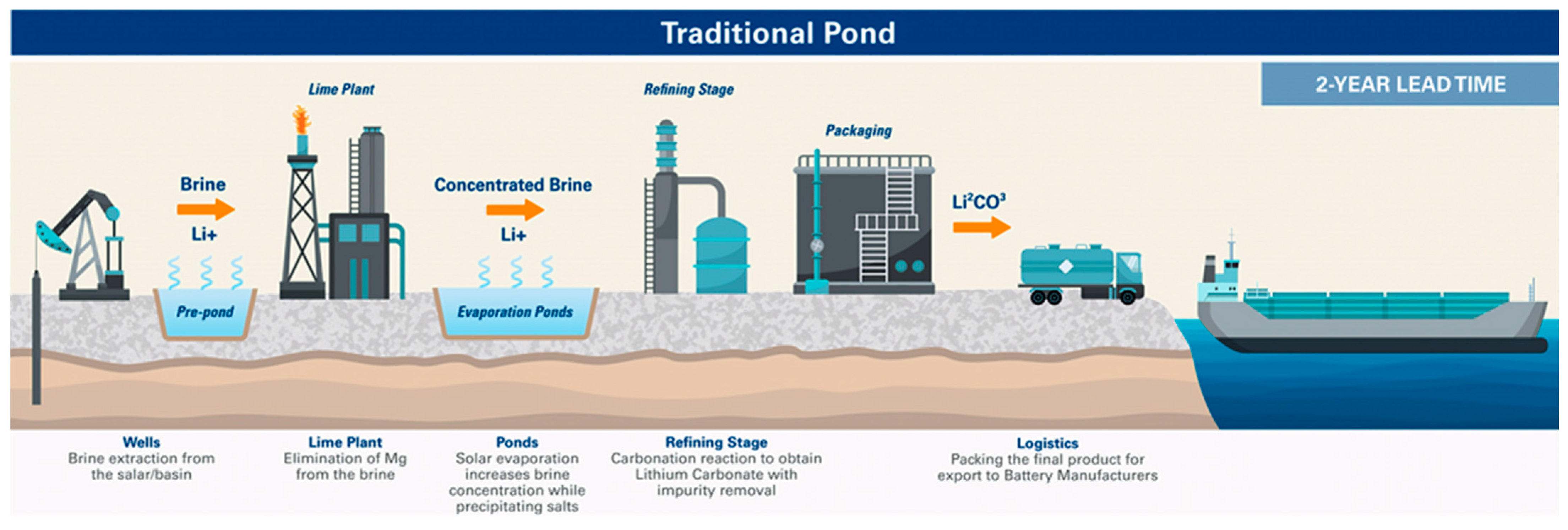 Over the years, the extraction method known as solar evaporation has been the most widely used [10,68,85,86,87]. Lithium-rich water deposits (brine wells) are pumped to the surface and placed into evaporation ponds for over 12–24 months under intense sunlight and dry conditions, which increases the concentration of dissolved salts. As the lithium-rich brine becomes more concentrated, it is transferred between ponds where calcium oxide (lime) is added to precipitate out the salt and impurities such as calcium, magnesium, and boron. Finally, sodium carbonate is added to the purified brine, which is then refined into Li2CO3 or processed further to produce LiOH [88].